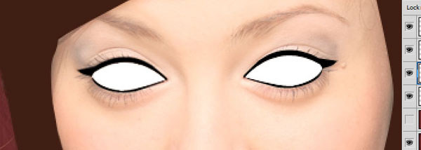 On the same layer you want to fill in the whites of the eyes. Simply do this by making your foreground color #ffffff and then using the Paint Bucket Tool to fill in your eye outlines.