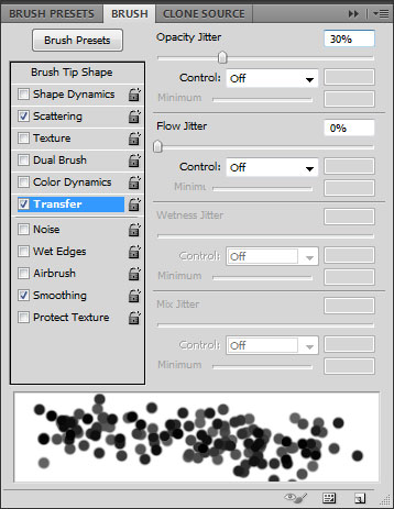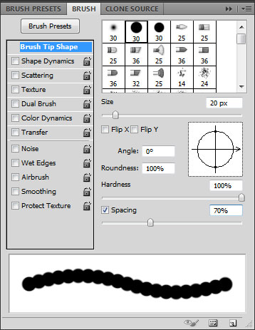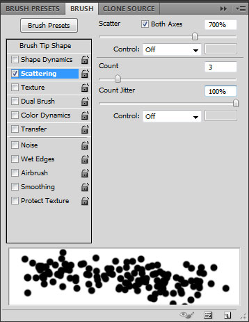 Select Brush Tool and press F5. Choose a hard round brush with 10 pixels and set up following presets for current brush: