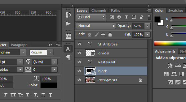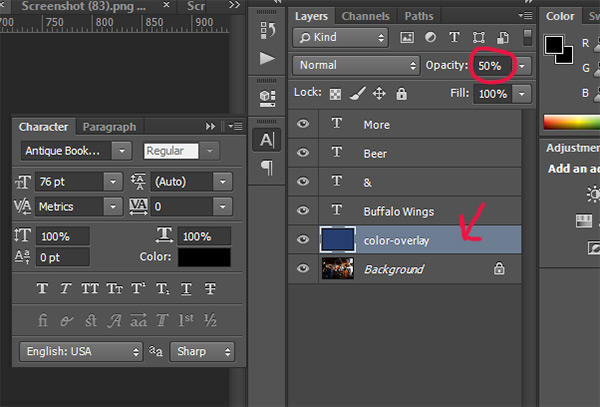 Finally, set the opacity of the layer to 50% and drag the layer below the text.