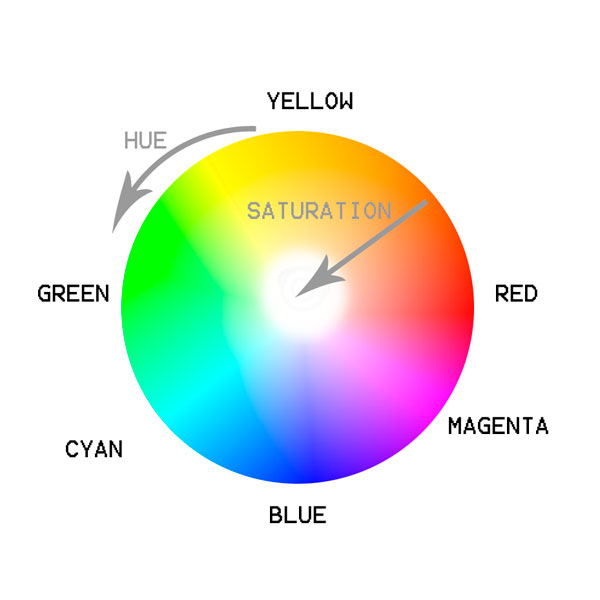 You can see from the chart that hue is the actual color while saturation is the intensity of that color. Brightness is the lightness of that color. Let me explain to you how I see the chart. Think of color as recipes and lights as ingredients. Each recipe has to have at least 1 ingredient (1 light) in order to work except for black which is the absence of light. So in order to get yellow I will have to add to my recipe red and green and I will have a fully saturated yellow. If I add blue to the recipe then the color migrates towards the center of the color wheel making my yellow less saturated.