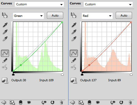 In order to color correct this image we add a Curves Adjustment layer (Layer > New Adjustment Layer > Curves) and slightly drag both the Red and Green curves downwards to lower the amount of light these channels contribute to the overall image.