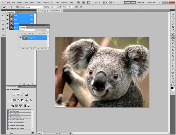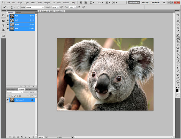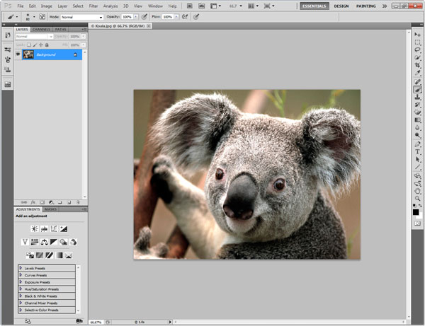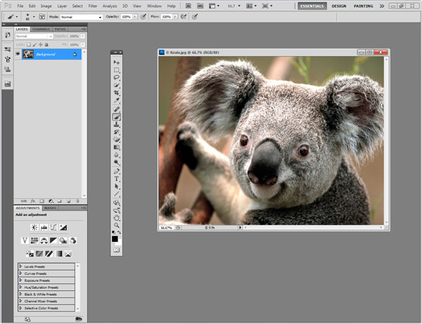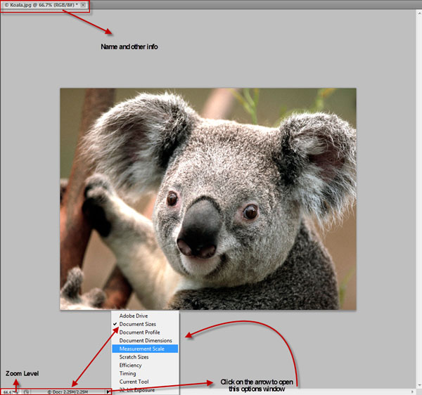 Next to image name (Koala.jpg) you can see some other info. “66.7%” is the actual zoom level. “(RGB” is the color mode and “/8#)” is the number of bits per channel or the image mode. Don’t worry too much about this info, you will get to know better what they mean in some later articles. And lastly “ * ” means that the image is not saved. If you save it that asterisk sign will disappear.
