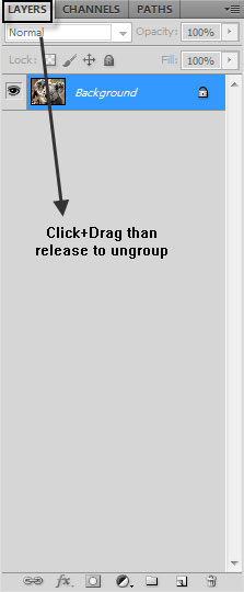 In the image above you can see a panel group. Layers panel, Channels panel and Paths panel are grouped together. If you want to ungroup let’s say Layers panel then simply click and drag the tab then release. You can see the results below.