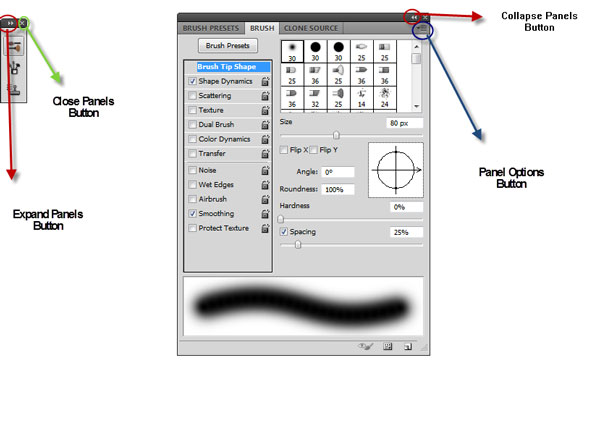 The collapse button behaves differently to the tools Panel. If you click on it it will arrange all the tools in a 2 column panel. If you click it again it will return to it’s default 1 column state. Take note that in older versions of Photoshop the 2 column panel is the default and the expand/collapse button is missing. We will analyze the Tools Panel in detail in a future article.