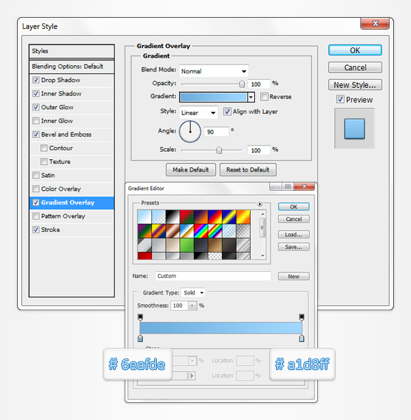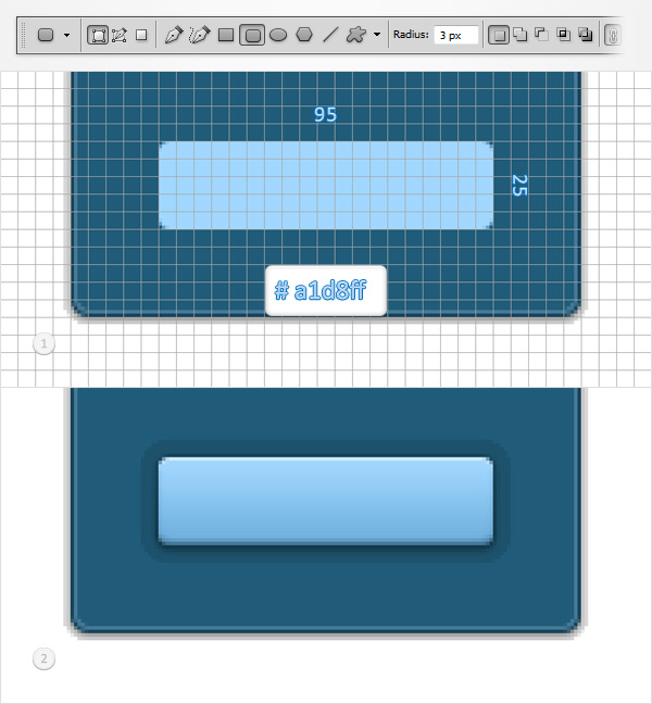 Set the foreground color to #a1d8ff, grab the Rounded Rectangle Tool, set the radius to 3px, create a 95 by 25px vector path and place it as shown in the first image.