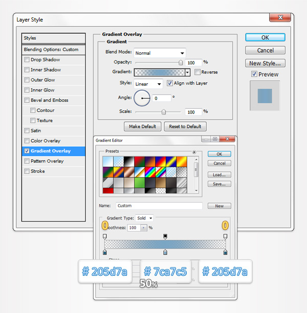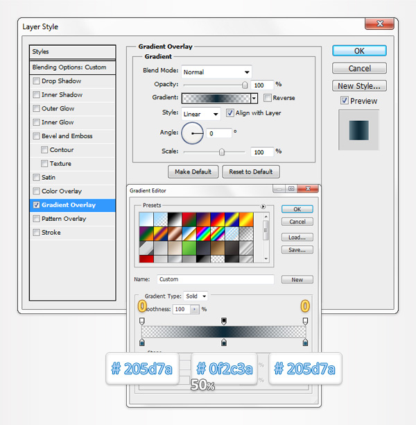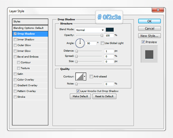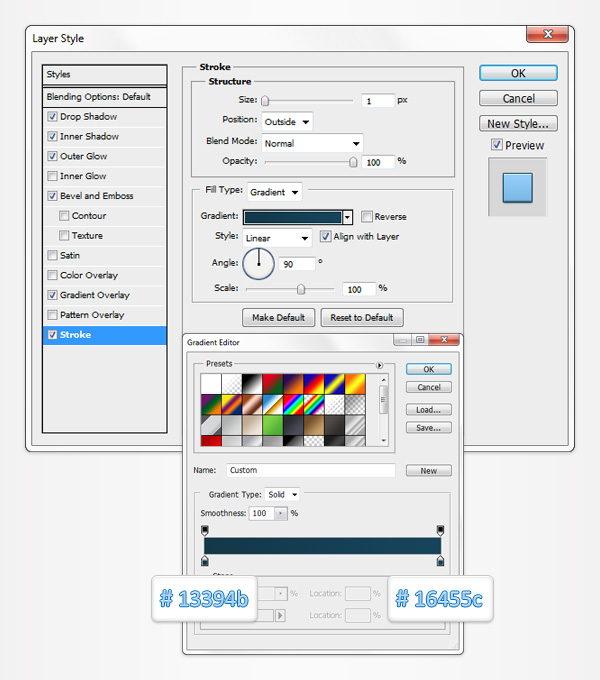 Move to the Layers panel, open the Layers Style window for this new shape and enter the properties shown in the following images.