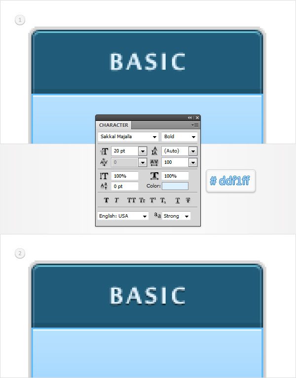 Open the Character panel (Window > Character), pick the Type Tool(T), set the color to #ddf1ff and add the “BASIC” piece of text as shown in the following image.