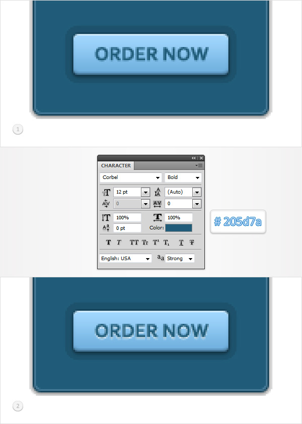 Pick the Type Tool(T), set the color to #205d7a and add the “ORDER NOW” piece of text as shown in the first image.