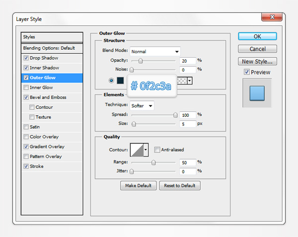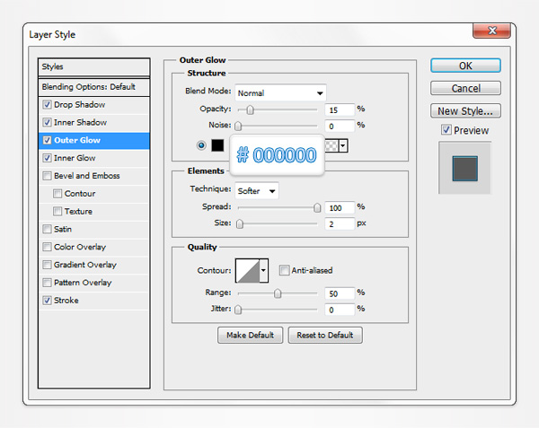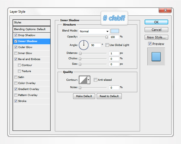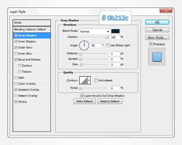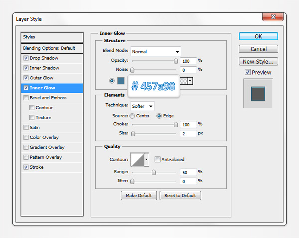 Activate the Drop Shadow, the Inner Shadow, the Outer Glow, the Inner Glow and the Stroke then enter the properties shown in the following images.