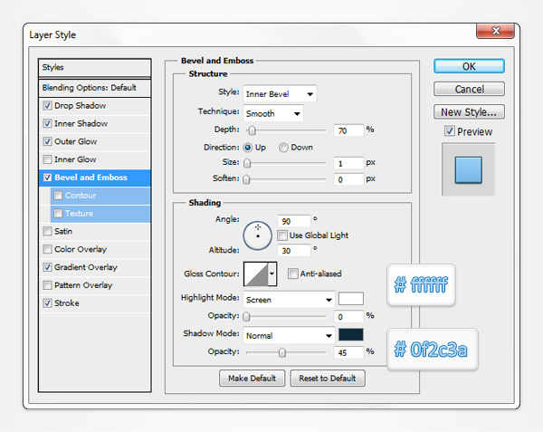 Move to the Layers panel, open the Layer Style window for this new pieces of text and enter the properties shown in the following image.
