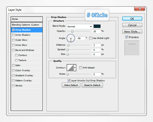 Use the Calibri font with the style set at Bold and the size set at 35pt. Move to the Layers panel, open the Layer Style window for this new piece of text and enter the properties shown in the following images.
