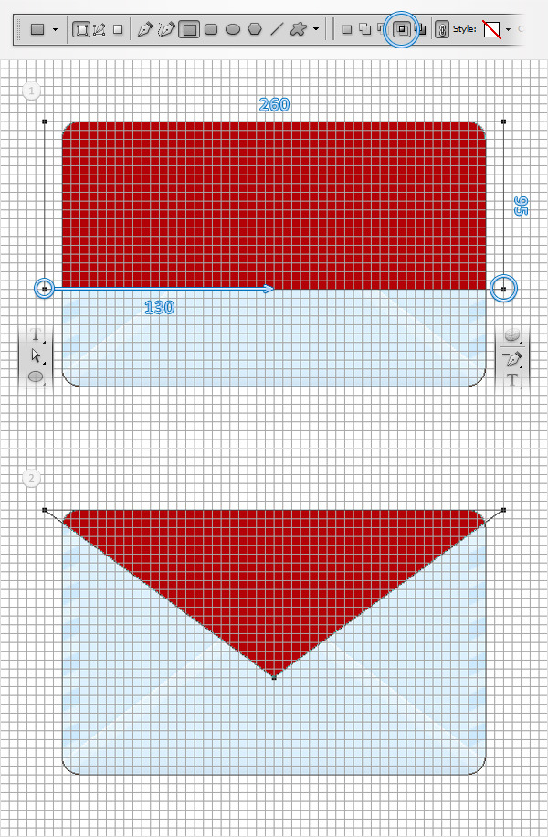 Make sure that your burgundy rounded rectangle is selected and pick the Rectangle Tool. Check the Intersect button from the top bar and draw a 260 by 95px vector shape as shown in the first image.