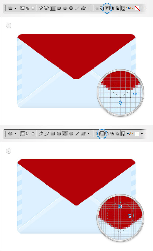 Keep focusing on the bottom side and switch to the Ellipse Tool. Check the Add button from the top bar and simply draw a 14px circle as shown in the second image.