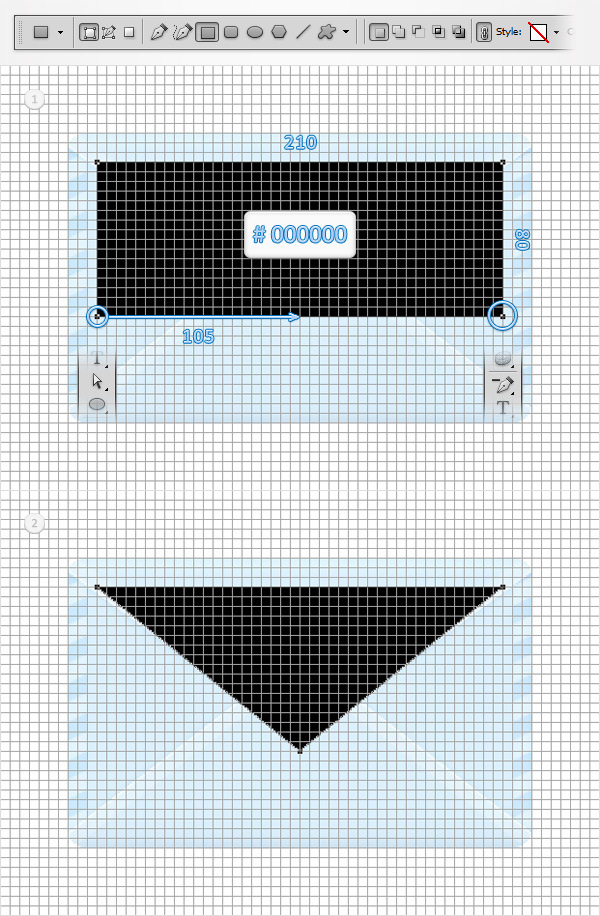 Set the foreground color to black, pick the Rectangle Tool, create a 210 by 80px vector shape and place it as shown in the first image.