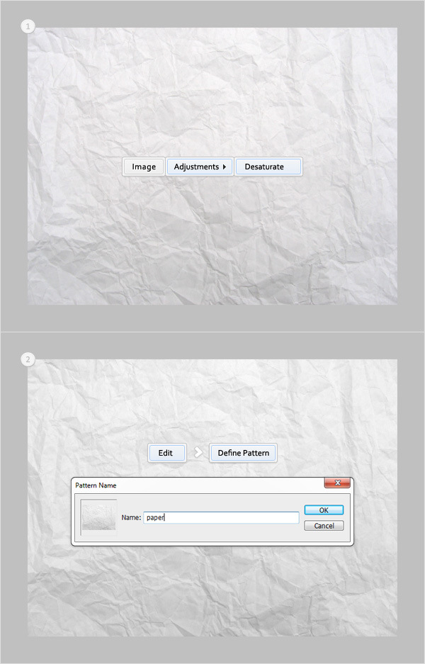 Next, you need to create a simple paper pattern. Open this paper image in Photoshop, go to Image > Adjustments > Desaturate then go to Edit > Define Pattern. Enter "paper" for the name then click OK. Close this document and go back to your envelope.