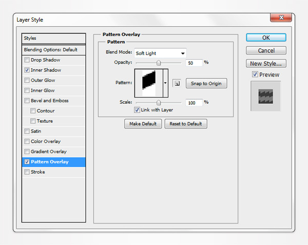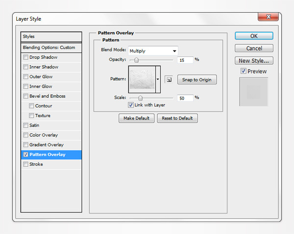 Duplicate "main" (Control + J), select the copy and bring it to the front (Shift + Control + ] ). Lower its Fill to 0% and open the Layer Style window. Activate the Pattern Overlay and enter the properties shown in the following image. Obviously, you need to use that "paper" pattern made in the previous step.