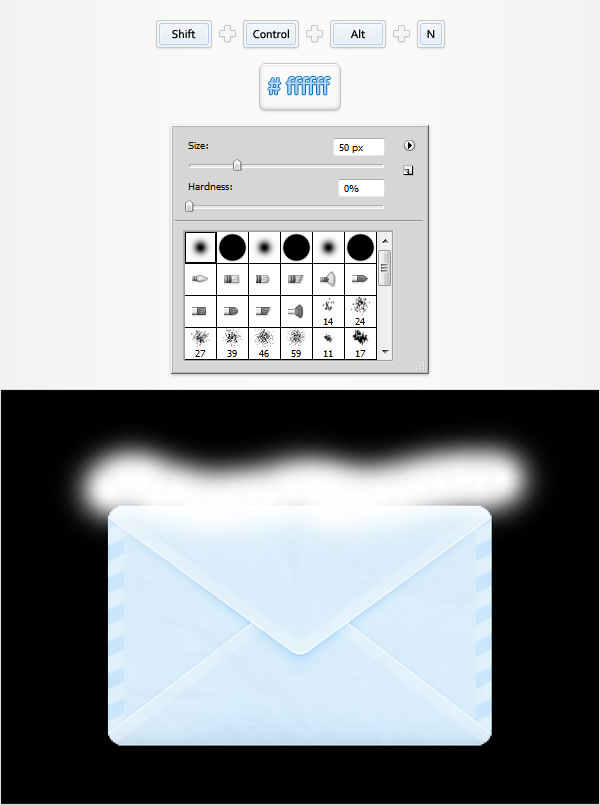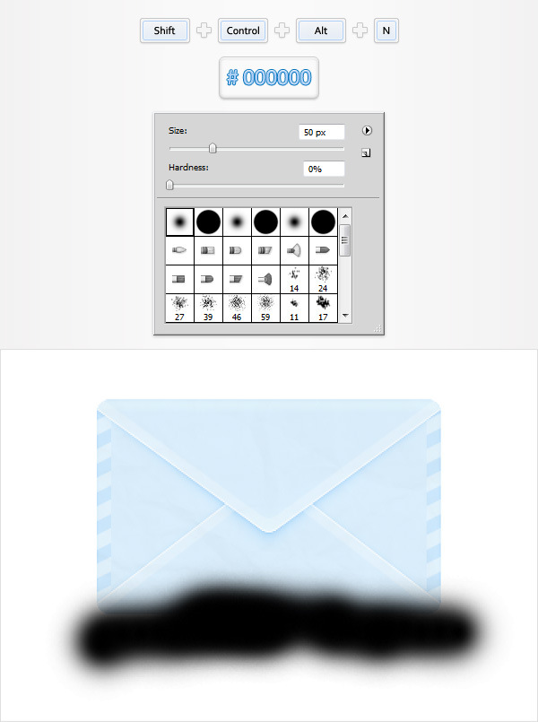 Create a new layer (Shift + Control + Alt + N), drag it in the top of the Layers panel and make sure that it stays selected. Set the foreground color to black, pick the Brush Tool and right click inside your document to open the Brush Preset picker. Pick a Soft Round brush, set the size to 50px and the Hardness to 0% then draw a random path along the bottom side of your envelope as shown in the following image.
