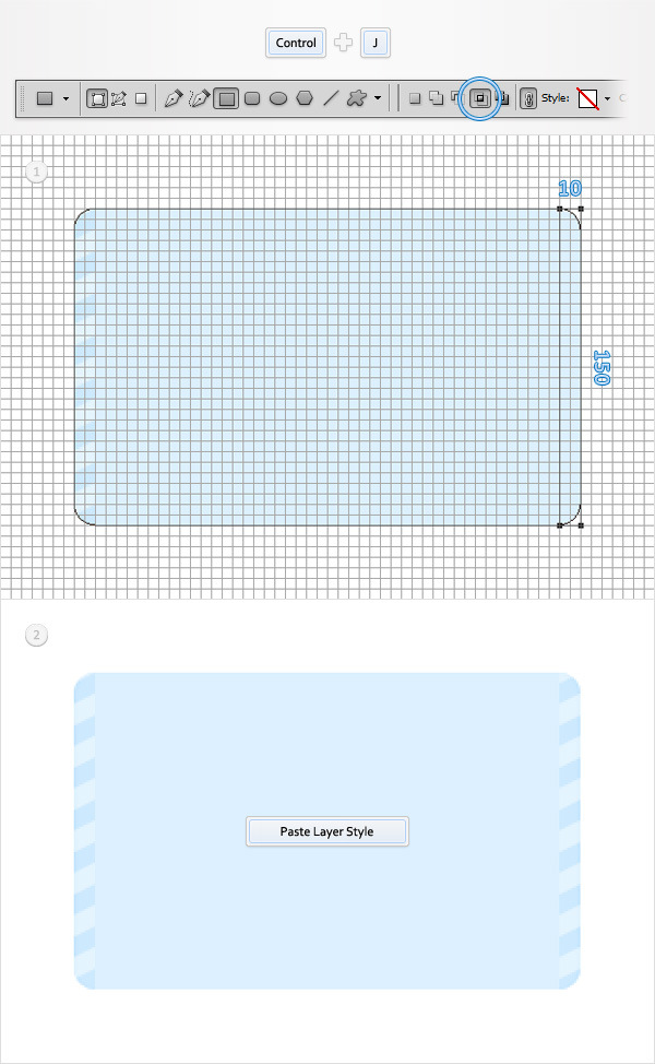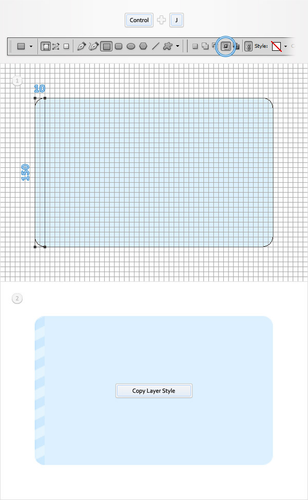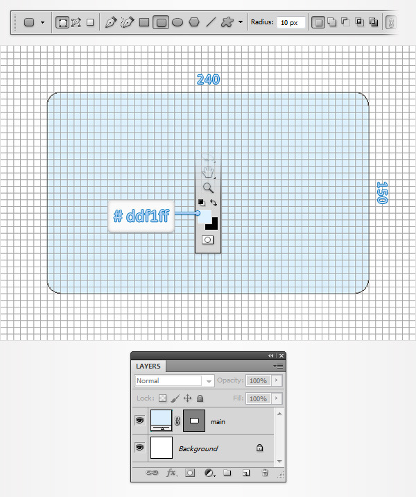 Set the foreground color to #ddf1ff and pick the Rounded Rectangle Tool. Focus on the top bar, set the radius to 10px then create a 240 by 150px vector shape. The Snap to Grid should ease your work. Move to the Layers panel and name this blue rounded rectangle "main".