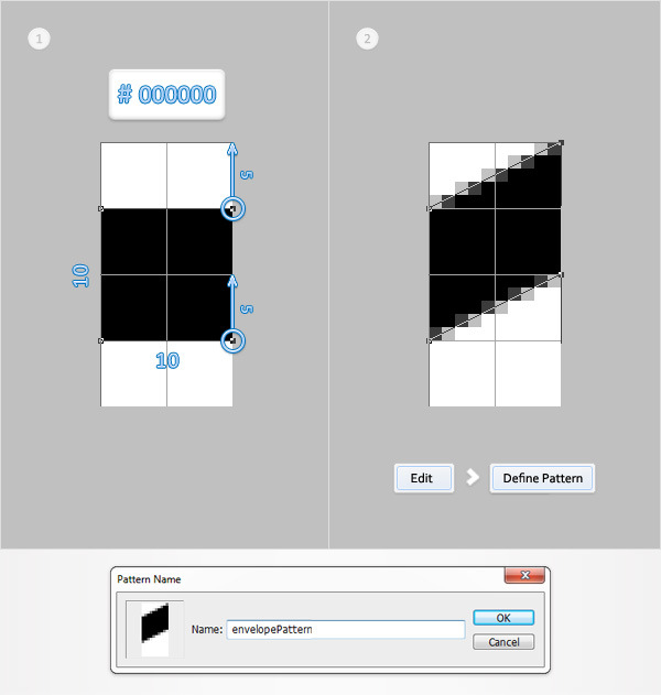 Next, you need to create a simple pattern. Hit Control + N to open the new document window. Enter 10 in the width box and 20 in the height box then click OK. Set the foreground color at black, pick the Rectangle Tool, create a 10px square and place it as shown in the first image. Make sure that this new vector shape stays selected, focus on its right side and switch to the Direct Selection Tool. Select both anchor points and simply drag them 5px up. In the end things should look like in the second image. Make sure that your black vector shape is not selected anymore and go to Edit > Define Pattern. Enter "envelopePattern" for the name and click OK. Close this document and return to the main one.