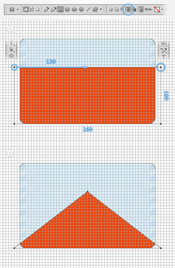Make sure that your orange rounded rectangle stays selected and pick the Rectangle Tool. Check the Intersect button from the top bar and draw a 260 by 100px vector shape as shown in the first image.