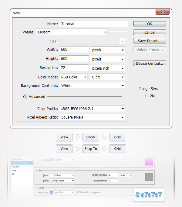 Enable the Grid (View > Show > Grid) and the Snap to Grid (View > Snap To > Grid). For starters you will need a grid every 5px. Go to Edit > Preferences > Guides, Grid & Slices and focus on the Grid section. Enter 5 in the Gridline Every box and 1 in the Subdivision box. Also, set the color of the grid at #a7a7a7. Once you set all these properties click OK. Don’t get discouraged by all that grid. It will ease your work later.
