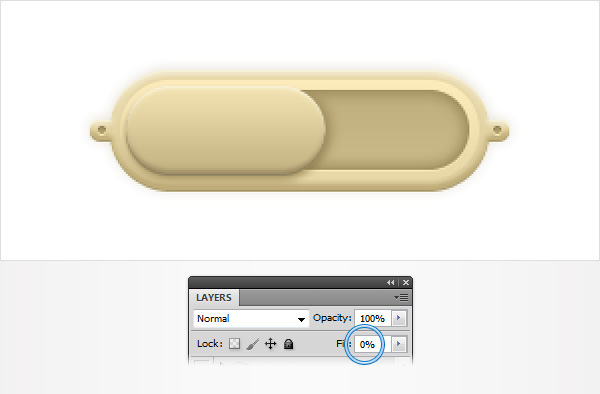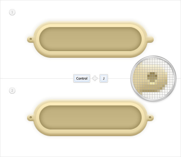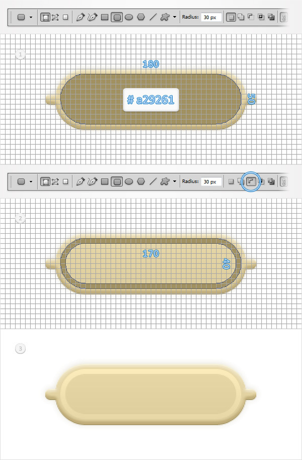 Set the foreground color at #a29261 and pick the Rounded Rectangle Tool. Create a 180 by 50px vector shape, place it as shown in the first image and make sure that it stays selected. Continue with the Rounded Rectangle Tool, focus on the top bar and check the Subtract button.