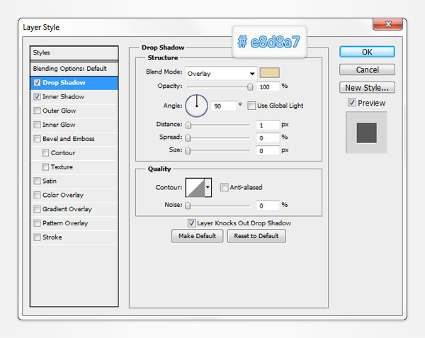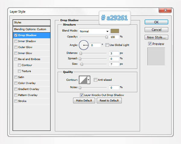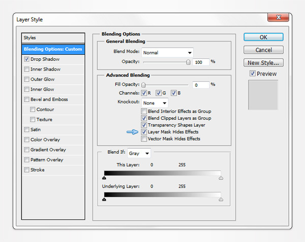 Reselect the masked vector shape made in the previous step, lower its Fill to 0% then open the Layer Style window. Check the "Layer Mask Hides Effects" box then activate the Drop Shadow and enter the properties shown in the following image.