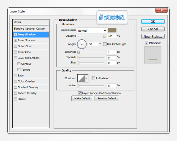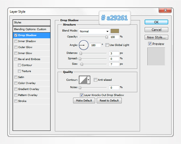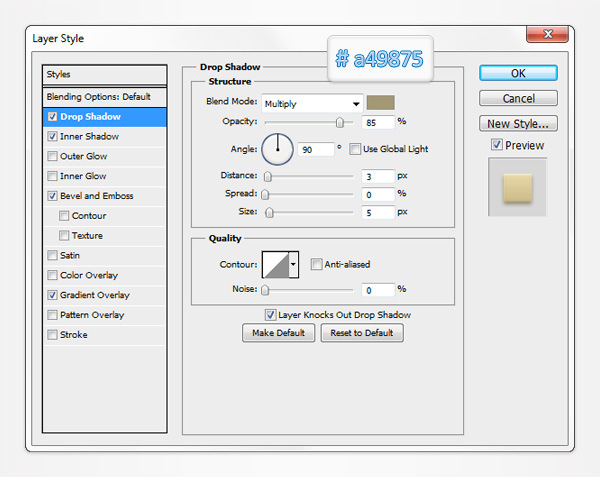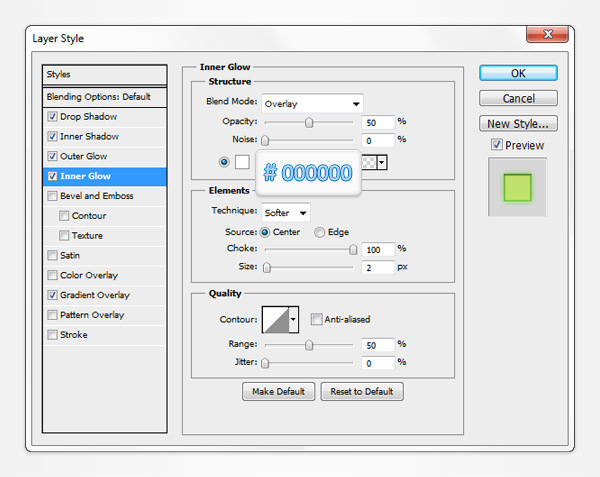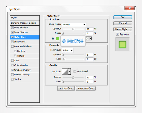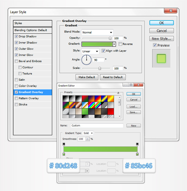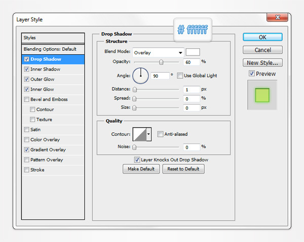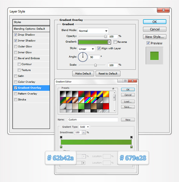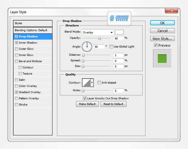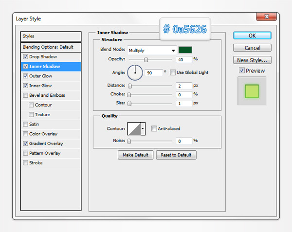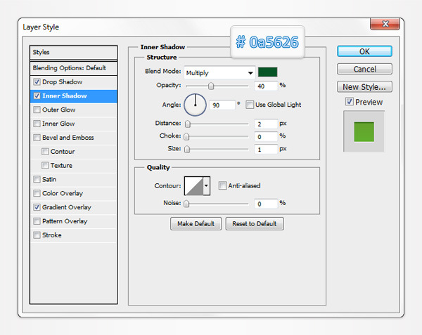 Select the vector shape made in the previous step and place it as shown below. Open the Layer Style window for this green path and enter the properties shown in the following images.