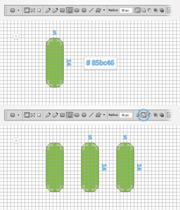 Set the foreground color at #85bc46, pick the Rounded Rectangle Tool, create a 5 by 14px vector shape and make sure that its stays selected. Continue with the Rounded Rectangle Tool, check the Add button from the top bar then add two, 5 by 14px rounded rectangles as shown in the second image.