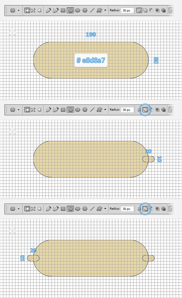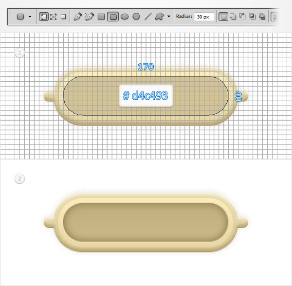 Set the foreground color at #e8d8a7, pick the Rounded Rectangle Tool and focus on the top bar. Set the radius at 30px, create a 190 by 60px vector shape and make sure that it stays selected.