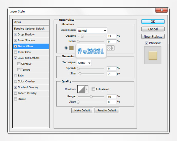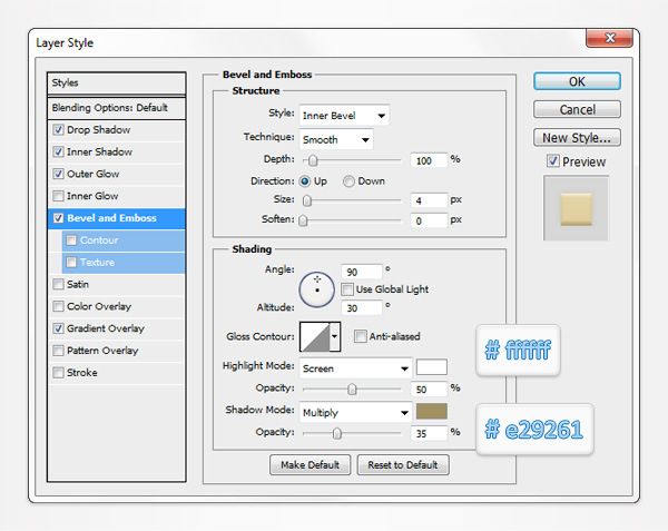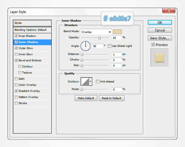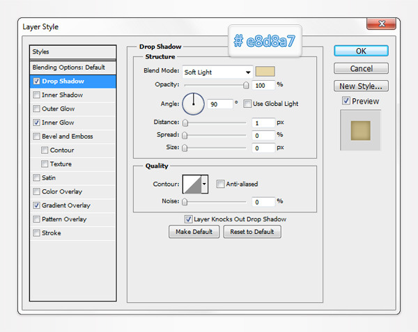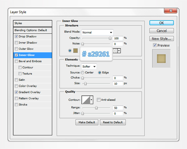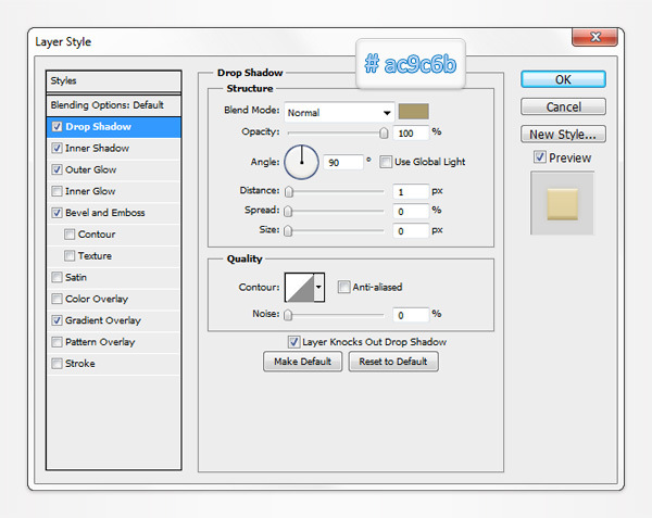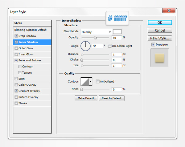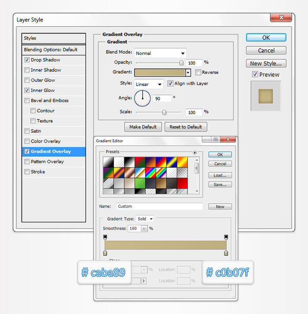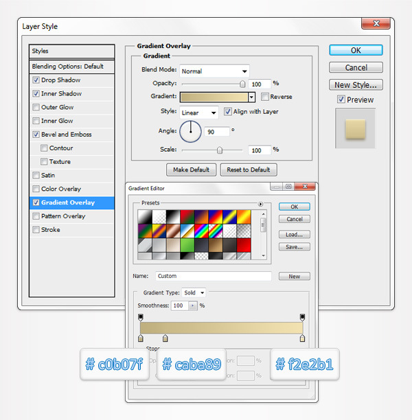Set the foreground color at #d4c493 and pick the Rounded Rectangle Tool. Create a 170 by 40px vector shape and place it as shown in the first image. Open the Layers Style window for this new vector shape and enter the properties shown in the following images.