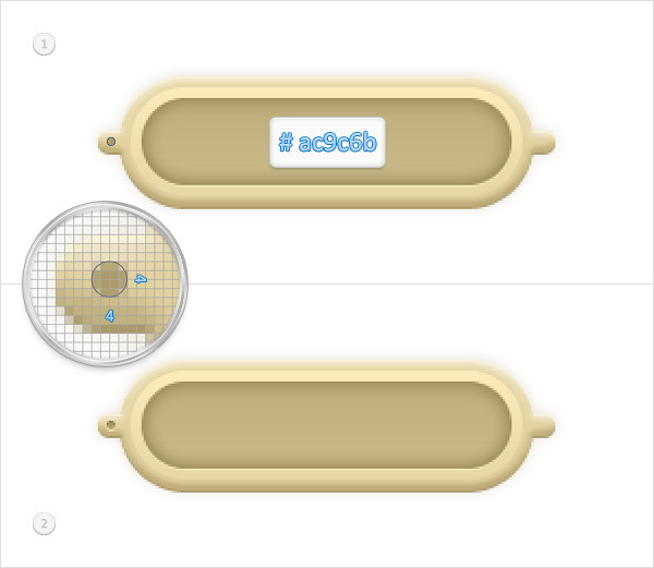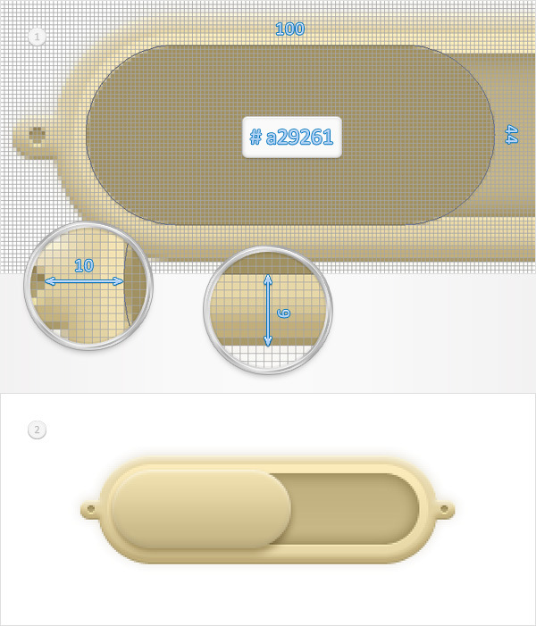 Set the foreground color at #a29261 and pick the Rounded Rectangle Tool. Create a 100 by 44px vector shape and place it as shown in the first image.