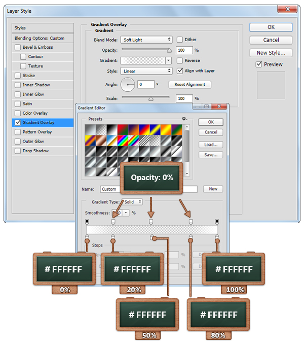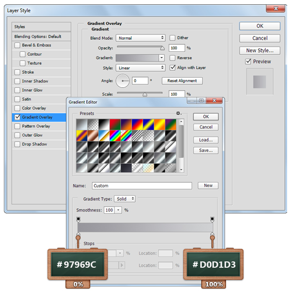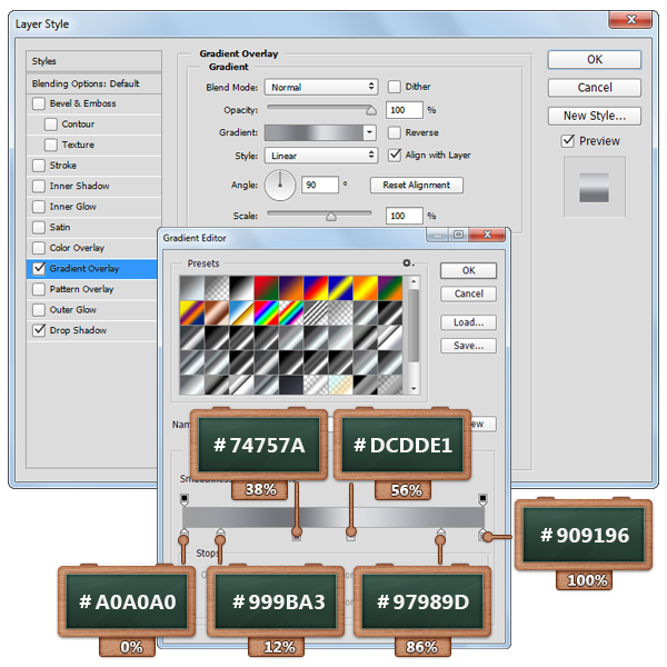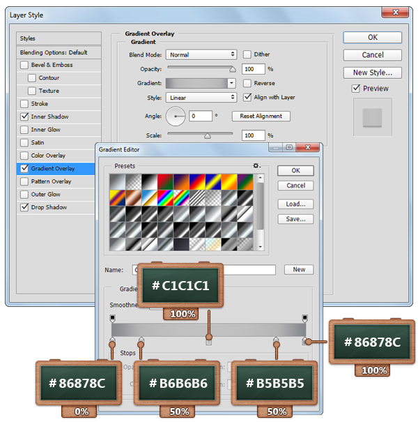 Open the Layer Style window for the vector shape edited in the previous step and enter the settings shown in the next images.