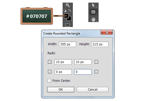 Set the foreground color to #070707, select the Rounded Rectangle Tool and click on your canvas to open “Create Rounded Rectangle” window.