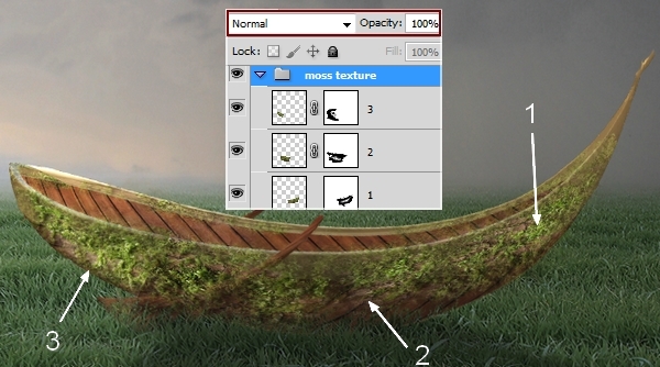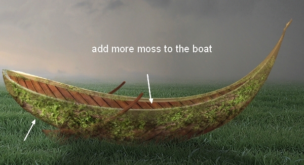Add a layer mask to the moss layer. Use grass brush, number 199 to trim the hard edges and blend the moss with the boat, lower the opacity of the brush while masking if needed to get a more natural result: