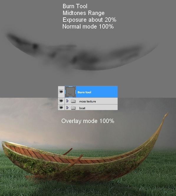 Make a new layer on the top using the same settings as in step 8. Use the Burn Tool to darken the boat more and give it a good contrast: