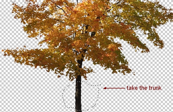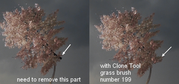 To remove the unwanted trunk part on the leaves, I made a new layer on the top and active Clone Tool (S). Change the brush to grass number 199 to clone over the indicated trunk: