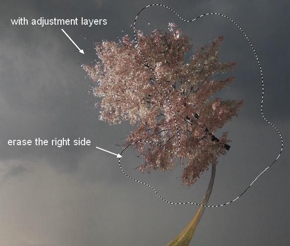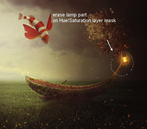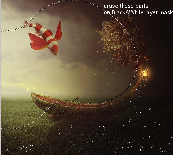 Change the mode of the Black & White layer to Soft Light 100%. On the Black & White layer mask erase the horizon part and sparkle and on the Hue/Saturation layer mask erase the lamp part: