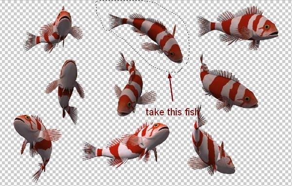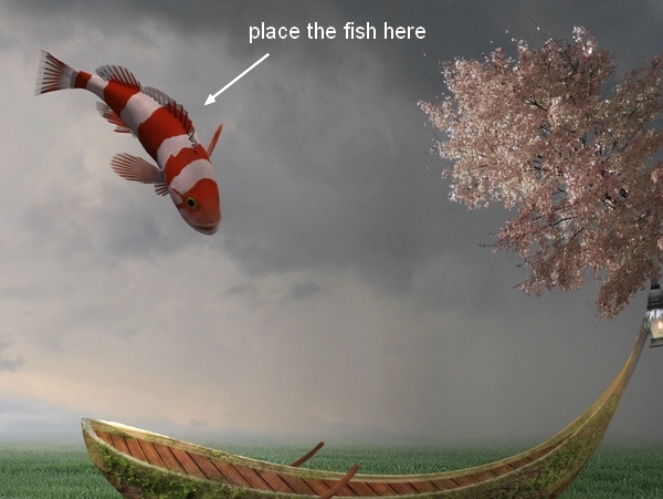 Open the fish stock. Choose the one you like and place him at the left of the picture, rotate him a little: