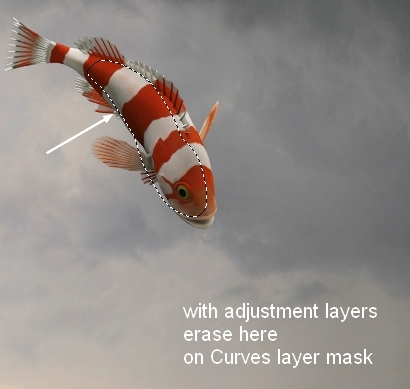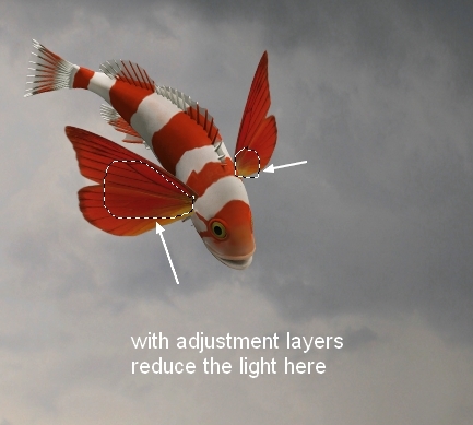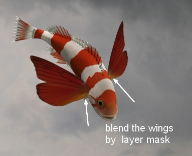 I used a layer mask to blend the wings with the fish: