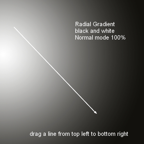 To create a nice contrast for the picture, I made a new layer above all other layers. Activate the Gradient Tool (G) and choose Radial Gradient with default colors (black and white). Drag a line from the top left to bottom right: