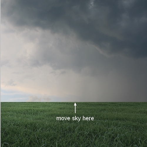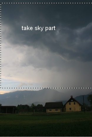Open the sky stock. Use the Retangular Marquee Tool to make a selection on the sky part and move it onto the upper part of our main document: