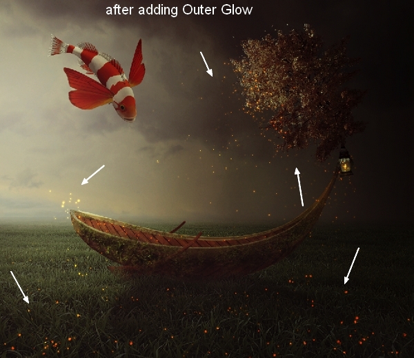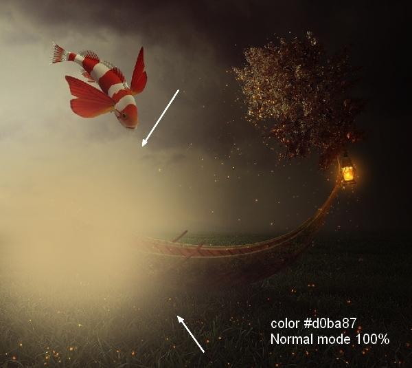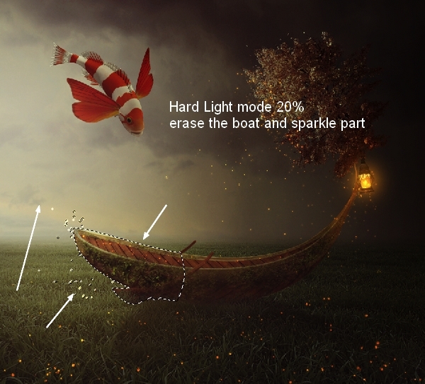 To create more light for the picture create a new layer and select the brush with color #d0ba87 to paint over the horizon. Change the mode to Hard Light 20% and use a layer mask to remove the effect on the boat and sparkle: