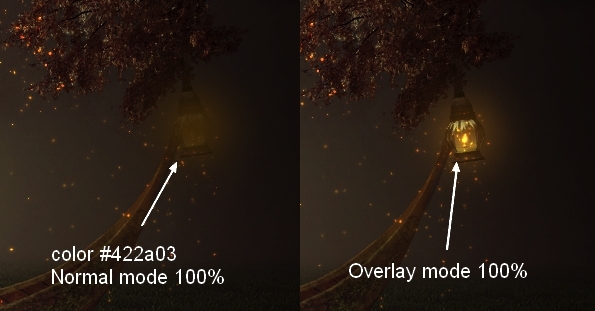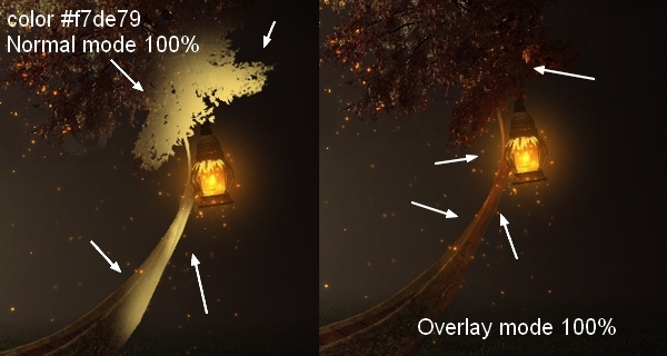 On a new layer use the same brush to make reflected light from the lamp. Set the mode to Overlay 100%: