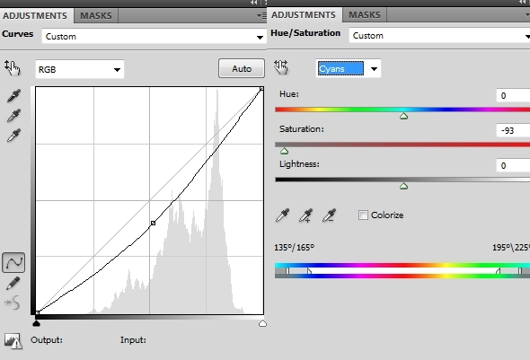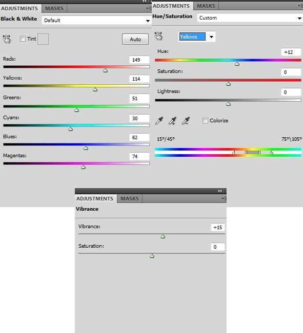 I used some adjustment layers to add more contrast and vibrance to the picture (Black & White, Hue/Saturation, Vibrance):