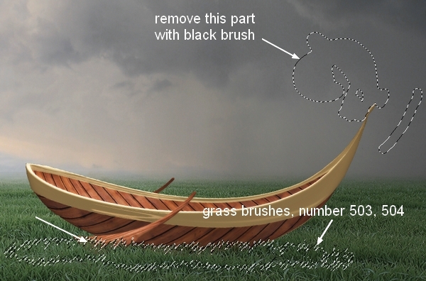 Add a layer mask to the boat layer. Use a black brush to remove the top right of the boat and then change brush to grasses. I chose number 503 and 504 to blend the edge of the boat into the grass: