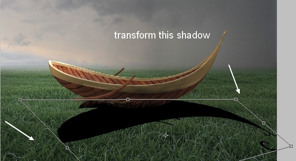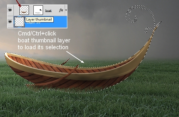 To make the shadow for the boat on the grass, make a new layer under the boat layer. Hold Cmd/Ctrl while clicking the boat thumbnail layer to load its selection: