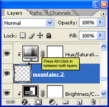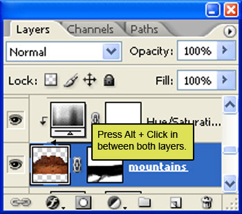 Press Alt+left click in between the 2 layer’s (Mountain1 layer and Hue/Saturation) to make a mask.