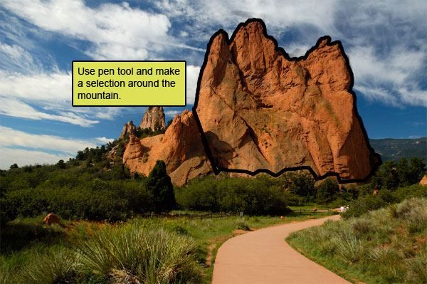 Click the Stock179 and press P to activate the Pen tool and then make a selection around the mountain and then click V to activate the Move Tool. Left-click the image and drag the image to the main canvas and change the layer name to “Mountain3”.