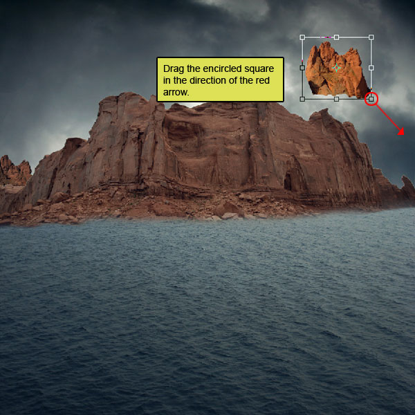 Next, activate the Transform tool (Ctrl/Cmd +T), then while the “Mountain3” layer is selected, resize it as shown below: